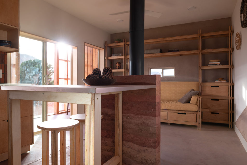 Power: A “Goal Zero” transfer switch allows the home to operate via portable batteries or generators even before it is connected to the electrical grid. Heating and Cooling: The design employs natural cross-ventilation strategies and a centrally located wood stove, reminiscent of a traditional Hogan’s hearth.