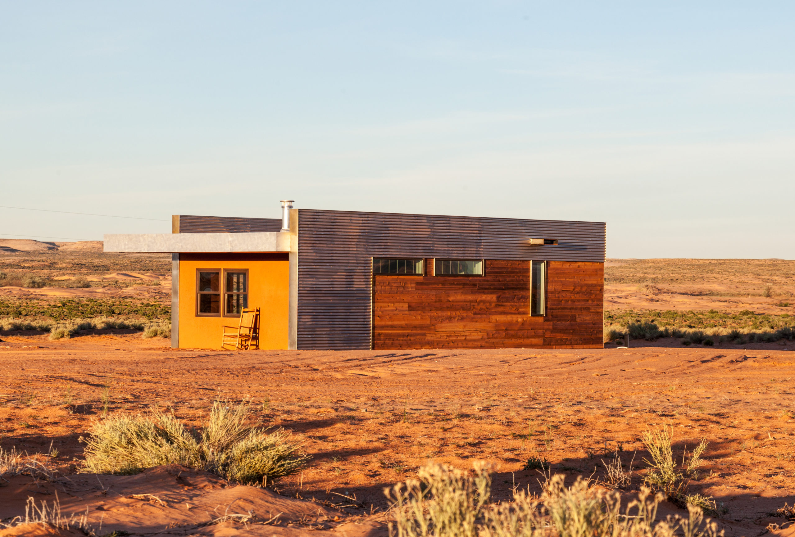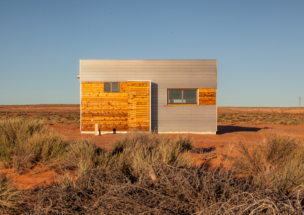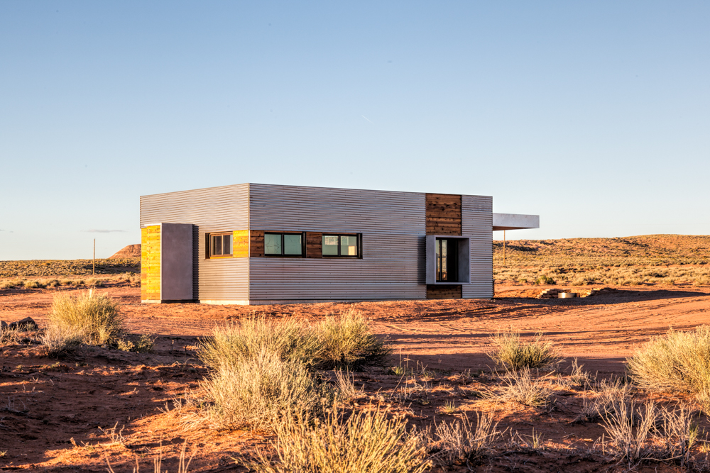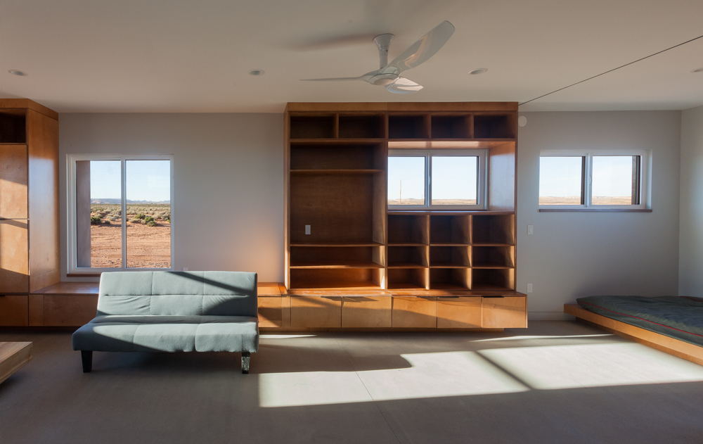 This 730 sqft "open floor plan" residence for a small family in the Mexican Water chapter of Navajo Nation is affectionately named Badger Springs after a nearby water source. The design blends with the sweeping desert vistas and is focused on delivering adaptability of use within a small foot print. A study originally begun to explore affordable and easily repeatable alternatives to the preexisting housing stock of the area, gained more refined customization as the students learned about their clients. As part of her charitable work to the community the matriarch of the family aids local victims of domestic violence. The idea that visitors would come to the home seeking healing and recovery motivated and directed the design team. This manifests through flexible and protected open space, both inside and out, that easily allows gathering of various sizes. The material palette intends to give an impression of tactility and warmth, echoing the clients affinity towards what has been coined a "rustic modern" aesthetic. Informed by the clients' deep knowledge of prevailing wind direction and sun path, a combination of satin aluminum door and window coverings, a cellulose-insulated chase wall, and recessed window planes ensure that minimal direct sunlight enters the home during summer months, drastically reducing solar gain and enhancing passive cooling and ventilation. Protruding well out into the landscape, a large overhang to the East provides protection from the elements as well as covers a natural plaster wall, toned red according to the locally sourced sand and clay. Exterior façade decisions were based on a material’s ability to adapt to its environment, whether transforming and adapting through time or staying constant and unchanging. The functional program was situated around the idea that the space would conform to the client’s changing needs. The kitchen, featuring a recycled PaperStone countertop, runs linear along the north wall illuminated by overhead clerestory windows. The exterior plaster wall carries into the interior and frames a wood burning stove that doubles as a second cook top. To reinforce the home’s ability to maintain open space, consideration was taken to incorporate a large floor-to-ceiling built-in storage system that runs along the majority of the southern wall. Interior finishes include douglas fir tongue and groove slats salvaged from a mixture of old telephone poles, timber scraps, and remnants of bleacher seating from an old baseball diamond. Two robust sliding barn doors conceal the bathroom and pantry storage, accented by black metal hardware. Thanks to GRID Alternatives Tribal Program the project is outfitted with grid-tied photo-voltaic panels.