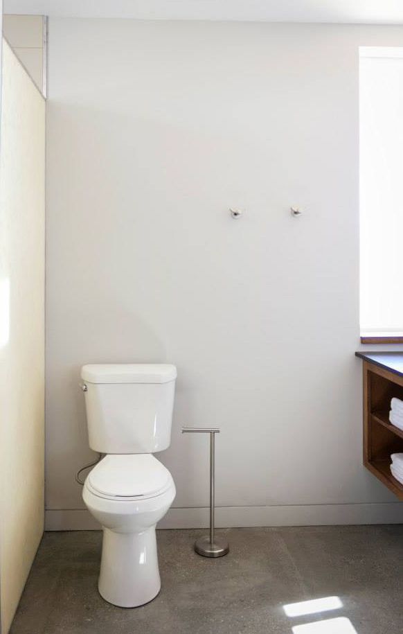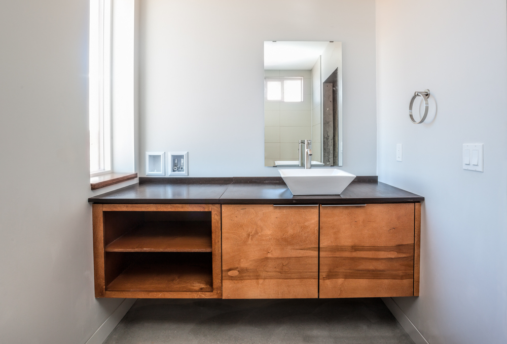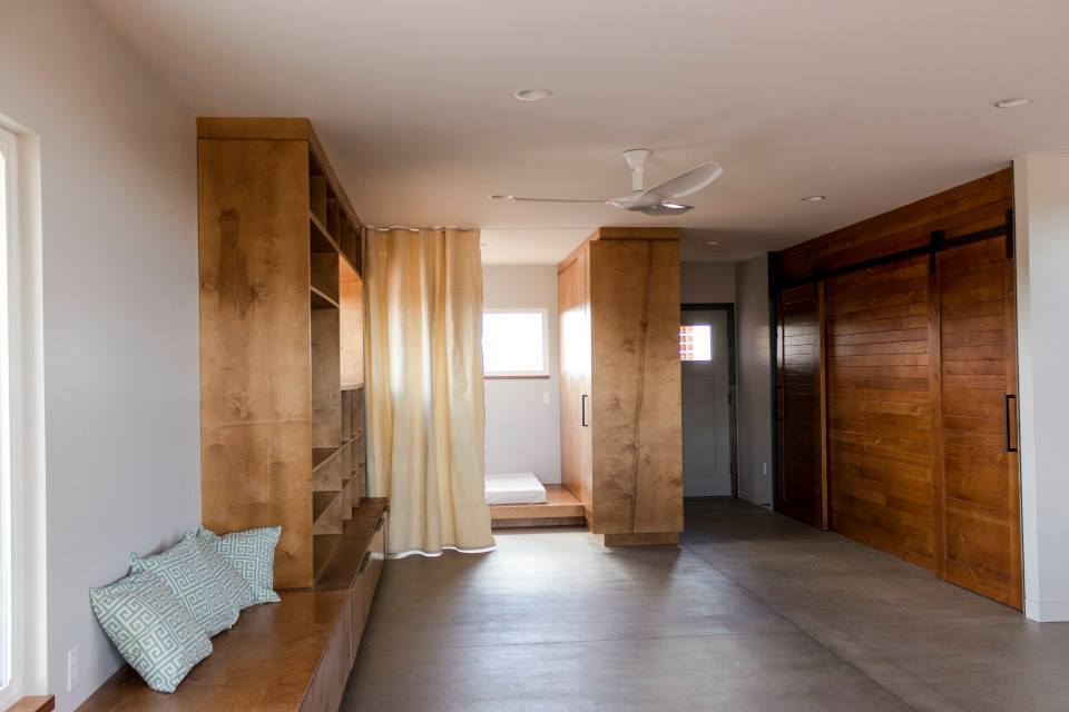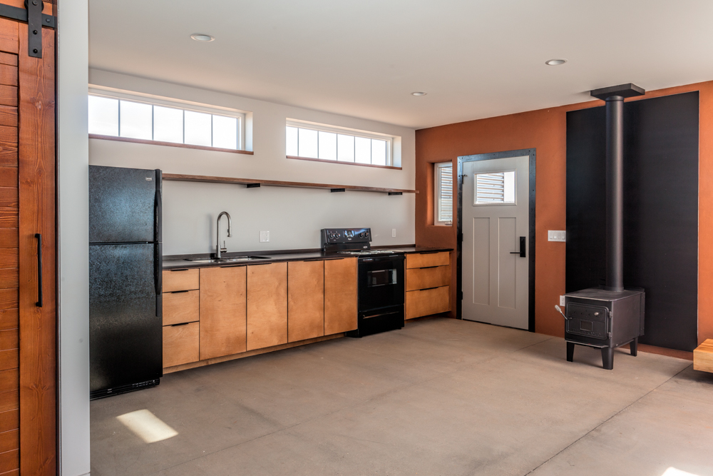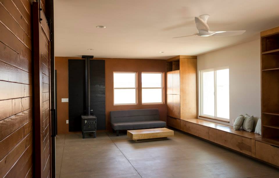 This 730 sqft "open floor plan" residence for a small family in the Mexican Water chapter of Navajo Nation is affectionately named Badger Springs after a nearby water source. The design blends with the sweeping desert vistas and is focused on delivering adaptability of use within a small foot print. A study originally begun to explore affordable and easily repeatable alternatives to the preexisting housing stock of the area, gained more refined customization as the students learned about their clients. As part of her charitable work to the community the matriarch of the family aids local victims of domestic violence. The idea that visitors would come to the home seeking healing and recovery motivated and directed the design team. This manifests through flexible and protected open space, both inside and out, that easily allows gathering of various sizes. The material palette intends to give an impression of tactility and warmth, echoing the clients affinity towards what has been coined a "rustic modern" aesthetic. Informed by the clients' deep knowledge of prevailing wind direction and sun path, a combination of satin aluminum door and window coverings, a cellulose-insulated chase wall, and recessed window planes ensure that minimal direct sunlight enters the home during summer months, drastically reducing solar gain and enhancing passive cooling and ventilation. Protruding well out into the landscape, a large overhang to the East provides protection from the elements as well as covers a natural plaster wall, toned red according to the locally sourced sand and clay. Exterior façade decisions were based on a material’s ability to adapt to its environment, whether transforming and adapting through time or staying constant and unchanging. The functional program was situated around the idea that the space would conform to the client’s changing needs. The kitchen, featuring a recycled PaperStone countertop, runs linear along the north wall illuminated by overhead clerestory windows. The exterior plaster wall carries into the interior and frames a wood burning stove that doubles as a second cook top. To reinforce the home’s ability to maintain open space, consideration was taken to incorporate a large floor-to-ceiling built-in storage system that runs along the majority of the southern wall. Interior finishes include douglas fir tongue and groove slats salvaged from a mixture of old telephone poles, timber scraps, and remnants of bleacher seating from an old baseball diamond. Two robust sliding barn doors conceal the bathroom and pantry storage, accented by black metal hardware. Thanks to GRID Alternatives Tribal Program the project is outfitted with grid-tied photo-voltaic panels.