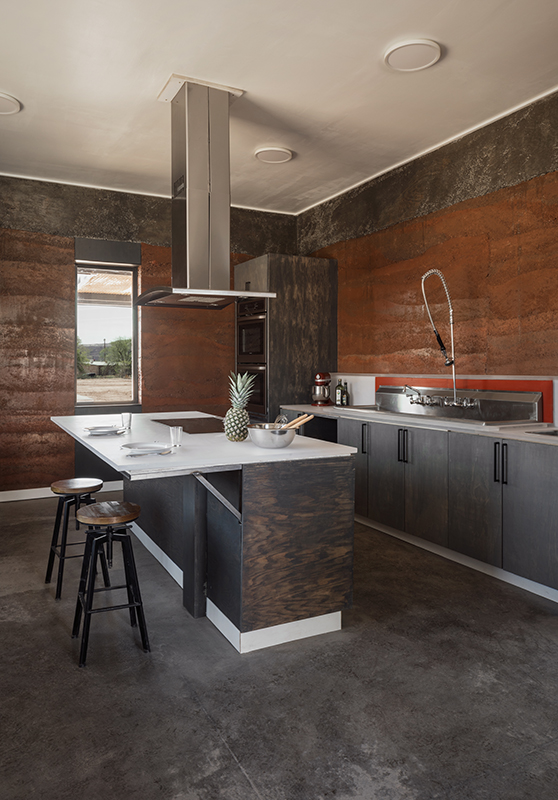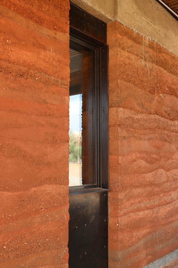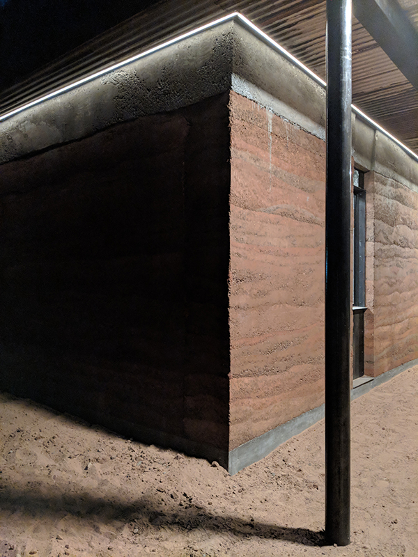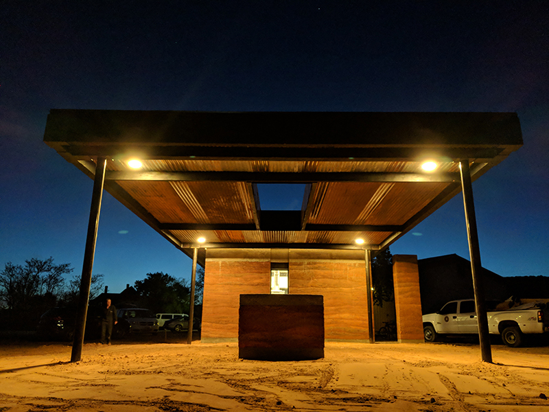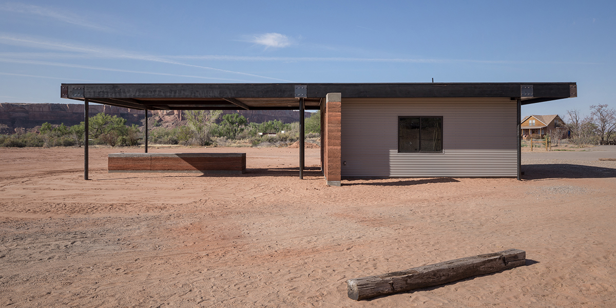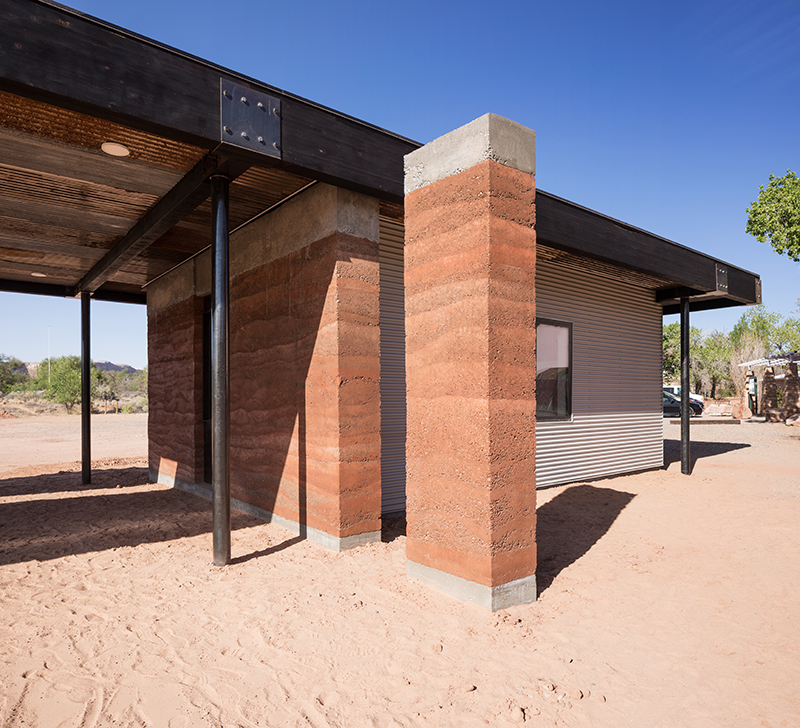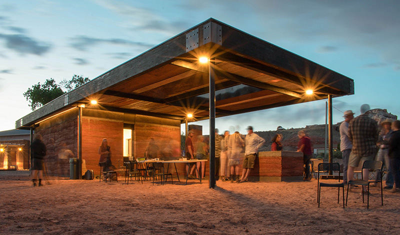The Bluff Community Center is the hub for activity in the small and changing town situated near the San Juan River in the Utah Four Corners. The site hosts a variety of programming for community members most days of the week and large annual events attracting crowds of out-of-towners. DesignBuildBLUFF worked with the Community Center Board to develop a master plan of these grounds, and Fire Mesa is its first realized component. The project balances the need for both rentable and public spaces. A 400 square foot commercial kitchen serves the existing community center building by making on-site food preparation possible. Set under the same large overhanging canopy as the kitchen is an exterior space which provides a public refuge from the desert sun during the day as well as a comfortable place to view the stars at night. The name Fire Mesa refers to a 14-foot long outdoor grill, a key piece of programming for the project that will serve as a gracious public amenity. This element mirrors the kitchen under the canopy and is oriented to the open side of the site. Imagined as a space for gathering, outdoor cooking, music, and recreation the grill is a fully accessible centerpiece that intends to activate the adjacent master plan proposals as they piece-by-piece come into realization. Rammed earth walls shield the kitchen from intense sun and strong winds, and help to temper the interior environment throughout the seasons by providing thermal mass. The labor-intensive construction process of the rammed earth walls was an opportunity to create a durable assembly using local, inexpensive materials, to tap into volunteer labor, and to introduce a new building technology to the community. The walls tell the story of their assembly. Each layer, or lift, is distinguishable and the visual and physical textures were directly affected through the process of slow and manual construction. In the spirit of the DesignBuildBLUFF program where improvising and innovating with recycled materials is convention, many of the finishes were salvaged or donated. The underside of the sprawling canopy is clad in corrugated metal leftover from previous projects and openings are finished with salvaged steel, while the glulam beams of the canopy were charred to darken and protect the wood. The project involved community members from beginning design processes via public workshops and through the building process by welcoming visitors to see progress and help in the construction.