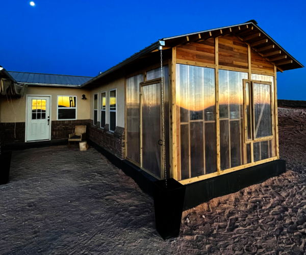 It is traditional in Navajo culture to enter the living space from the east. The front door faces east for this reason. Walking through the front door, one walks through the interior greenhouse, which softens the transition between outside and inside spaces.