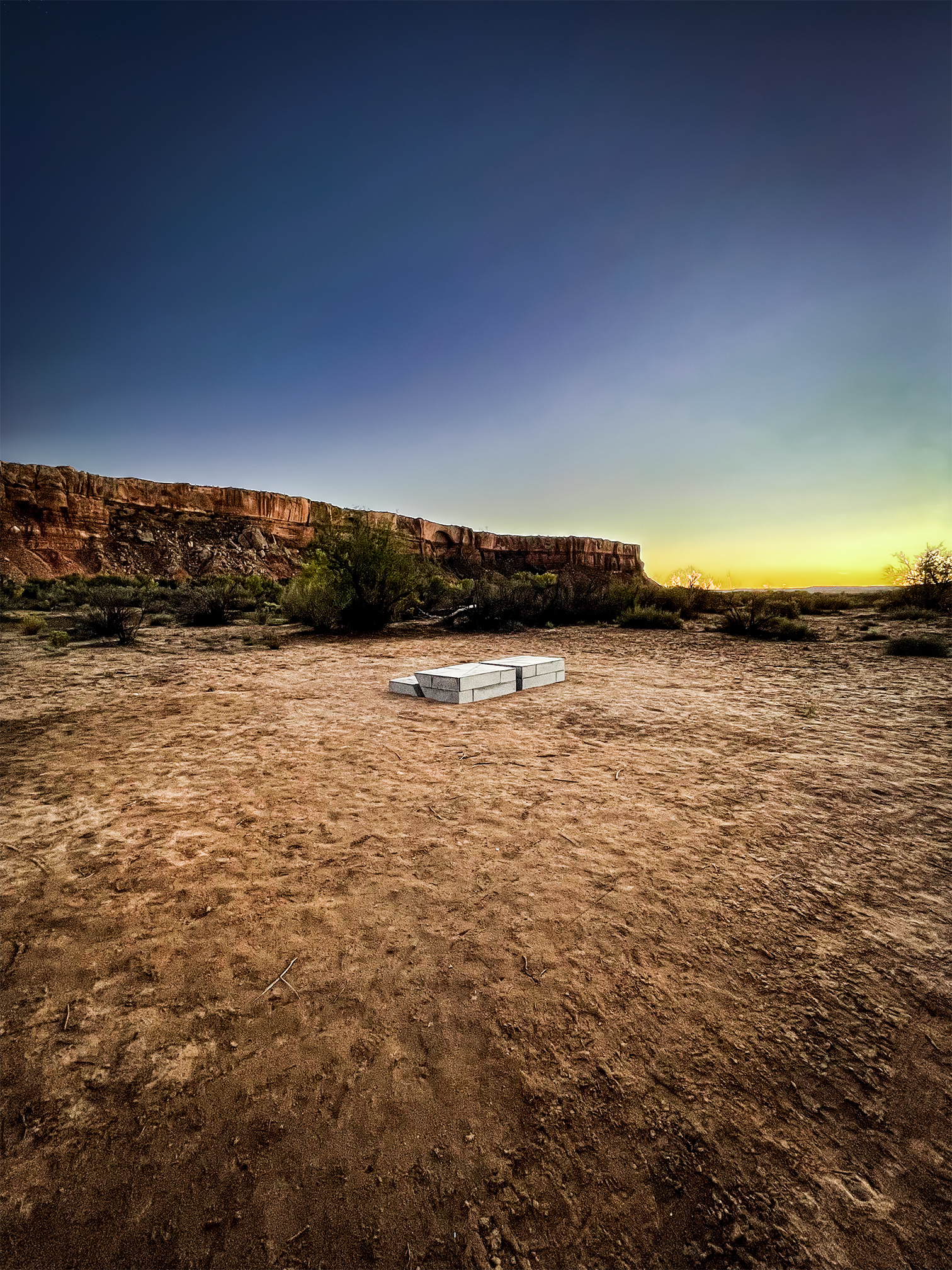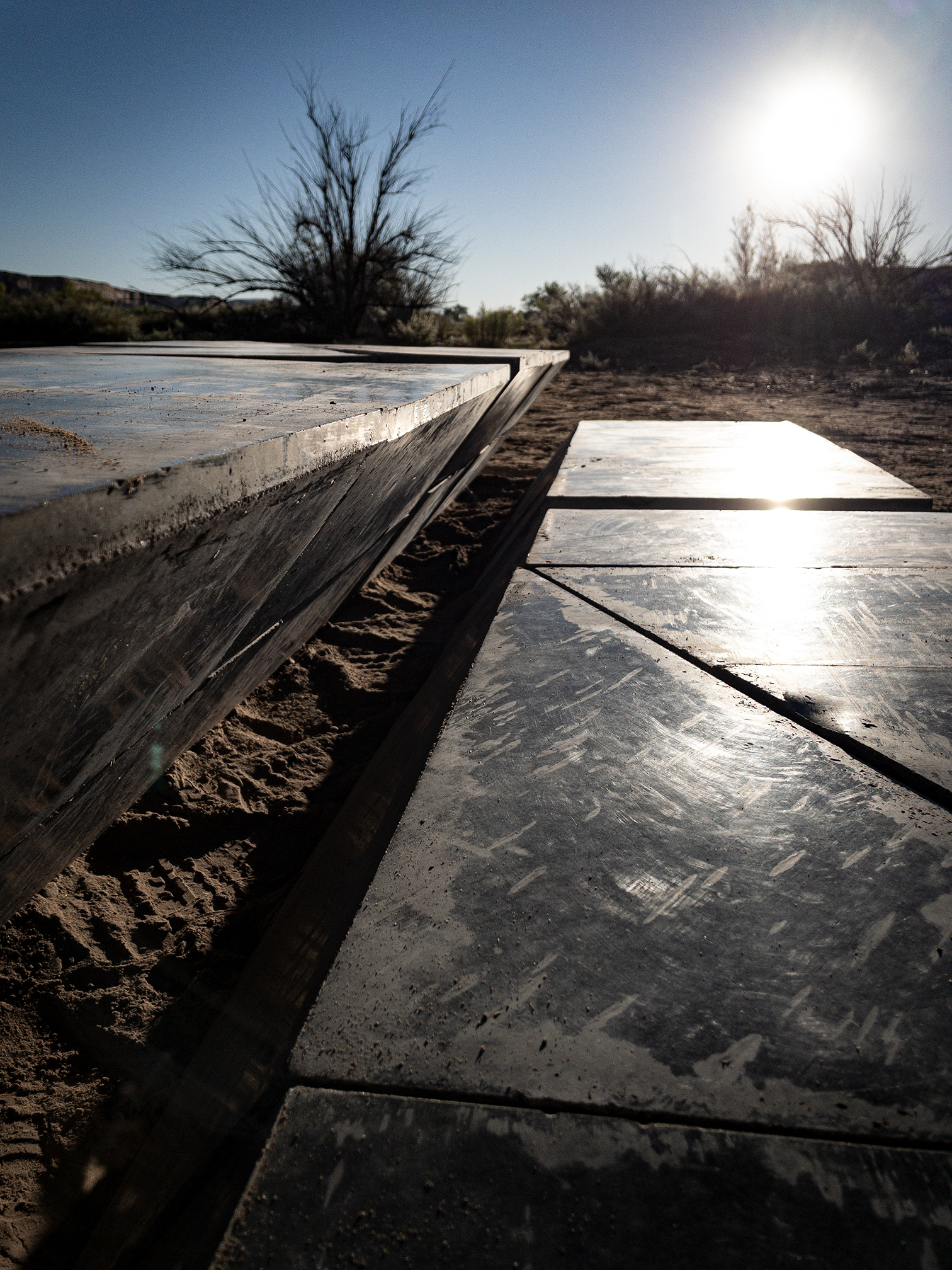 Since the concrete mass is 2.3t/m, the weight of each north block would be about 1.0t, and the weight of each south block would be around 0.4t. We think that styrofoam embedded in the concrete blocks would reduce the weight by 30~40%. We plan to assemble the north blocks from 18 pieces, and the south blocks from 8 pieces. Each piece would weigh around 70~100kg. The diagonal lines in the monument created by the division of the individual pieces, would coincide with the directions of the sunrises and sunsets of the summer/ winter solstices and the previous project sites. Also, the proportions of the top surfaces of the monument are determined by two different silver ratios.